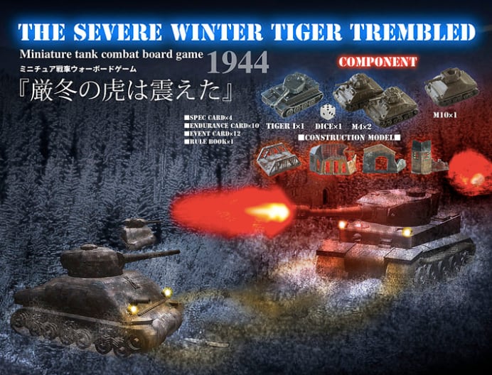 外箱 20×26cm ボード2枚 ミニチュア戦車4両 廃墟駒4つ ダイス、カード類を使い、ドイツ軍と連合軍(アメリカ)に分かれWW2のミニチュア戦車で対戦する局地戦闘ボードゲーム。 ストーリー 第二次世界大戦末期、ドイツ軍精鋭重戦車ティガーⅠとアメリカ軍主力戦車M4が厳冬のアルデンヌ街道で遭遇戦を行う。 駆動系が故障中のティガーⅠは、数に勝るアメリカ軍の包囲を突破し、ドイツ本国への撤退を成功させられるか。 公式サイトProductページにて仕様や詳細をご覧いただけます。 「厳冬の虎は震えた」 https://games.a-vipc.com/home/severewinter/