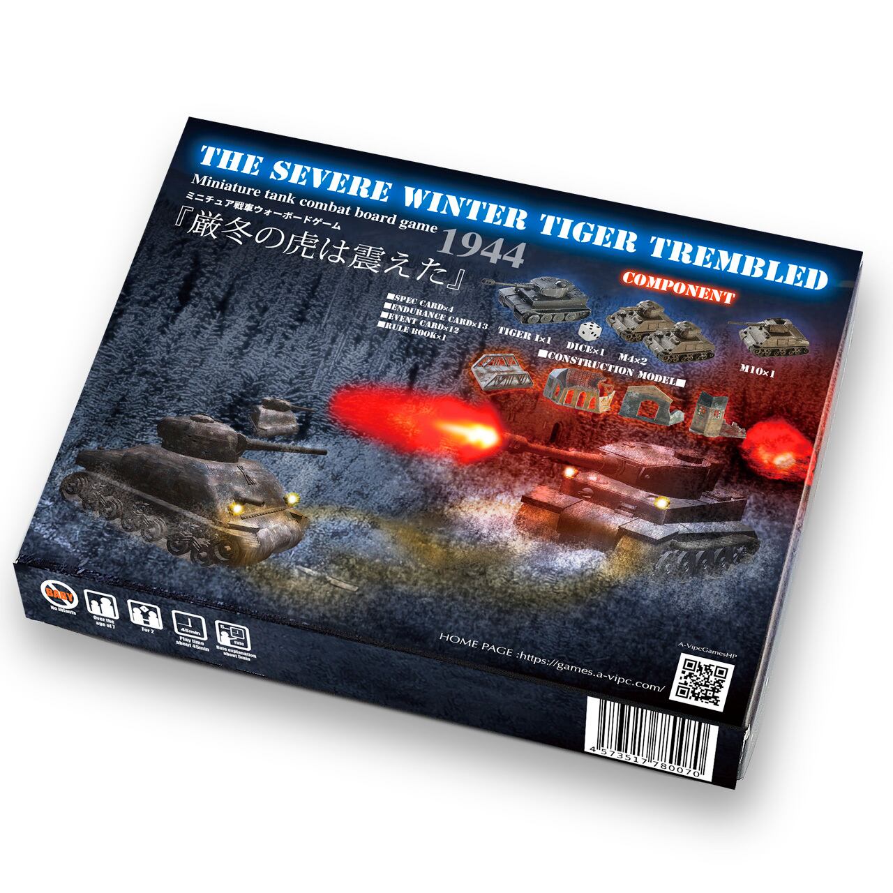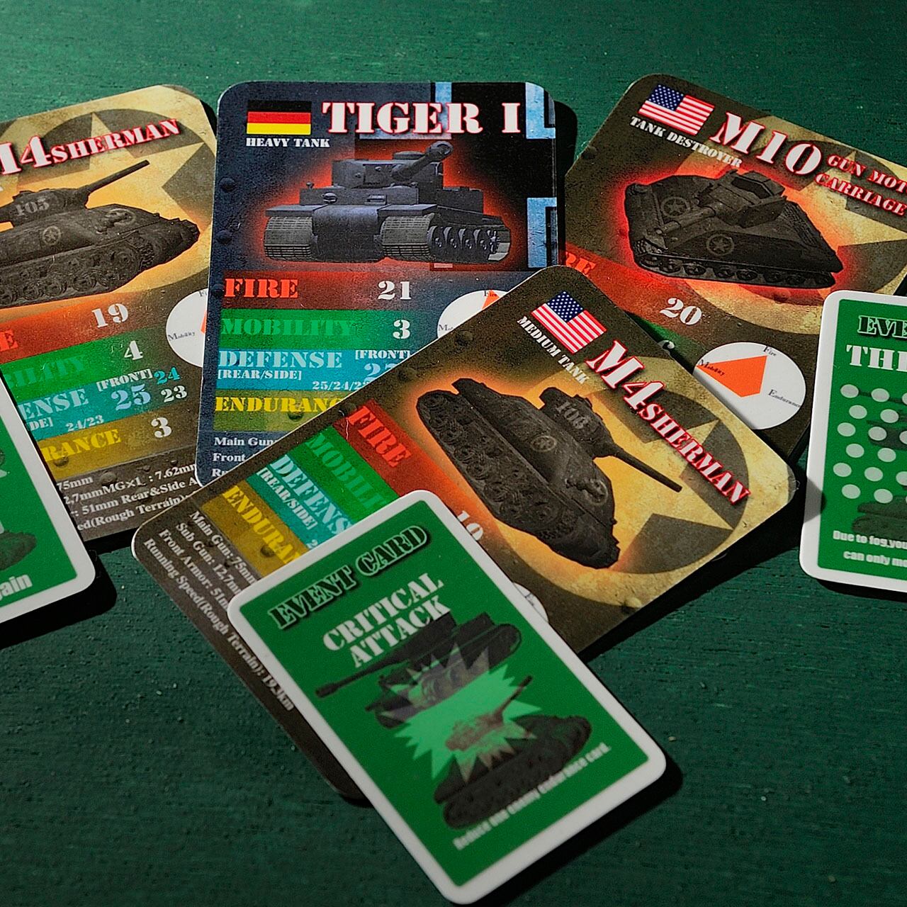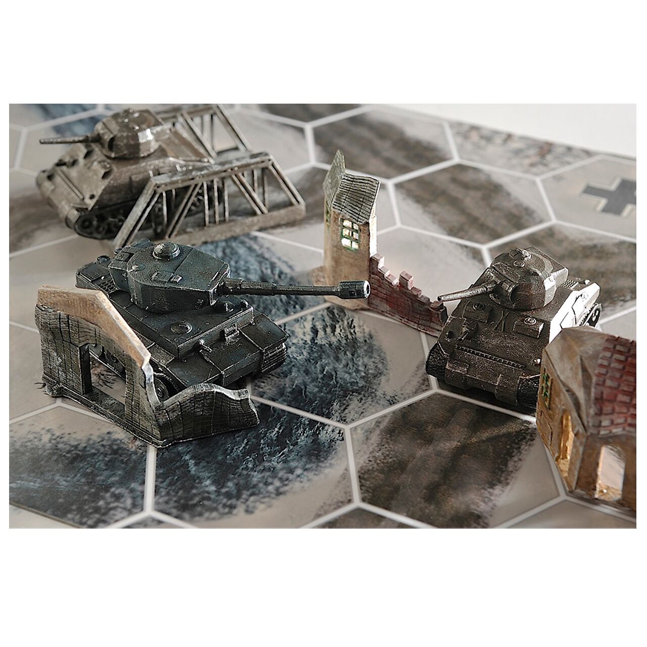 外箱 20×26cm ボード2枚 ミニチュア戦車4両 廃墟駒4つ ダイス、カード類を使い、ドイツ軍と連合軍(アメリカ)に分かれWW2のミニチュア戦車で対戦する局地戦闘ボードゲーム。