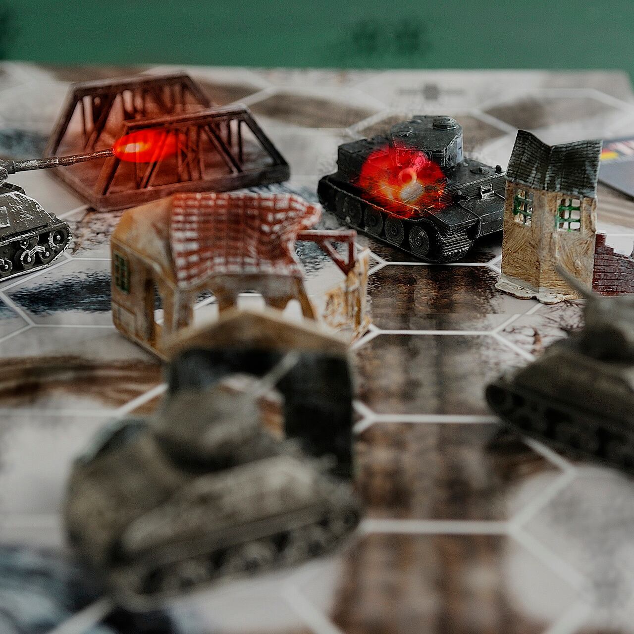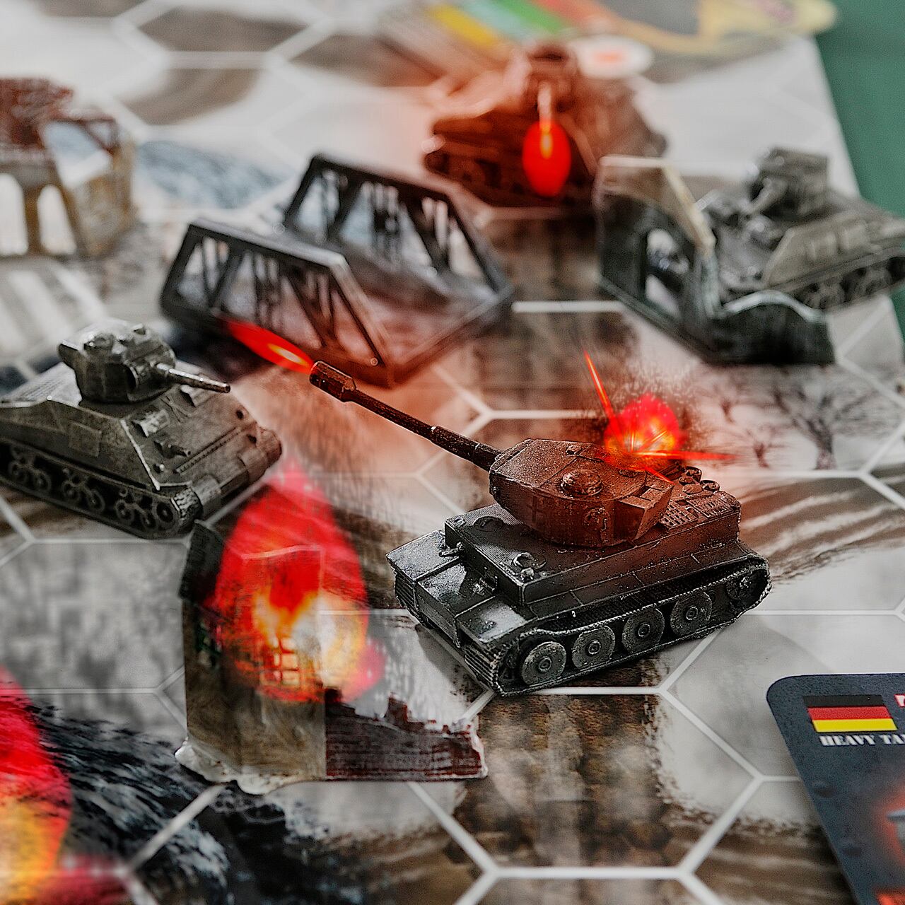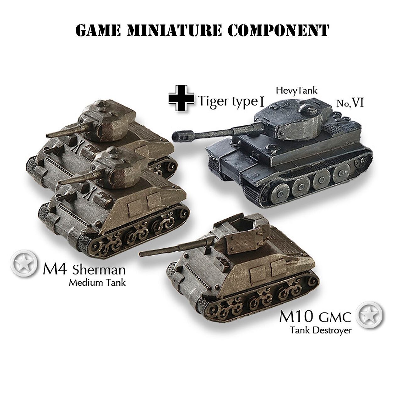 外箱 20×26cm ボード2枚 ミニチュア戦車4両 廃墟駒4つ ダイス、カード類を使い、ドイツ軍と連合軍(アメリカ)に分かれWW2のミニチュア戦車で対戦する局地戦闘ボードゲーム。