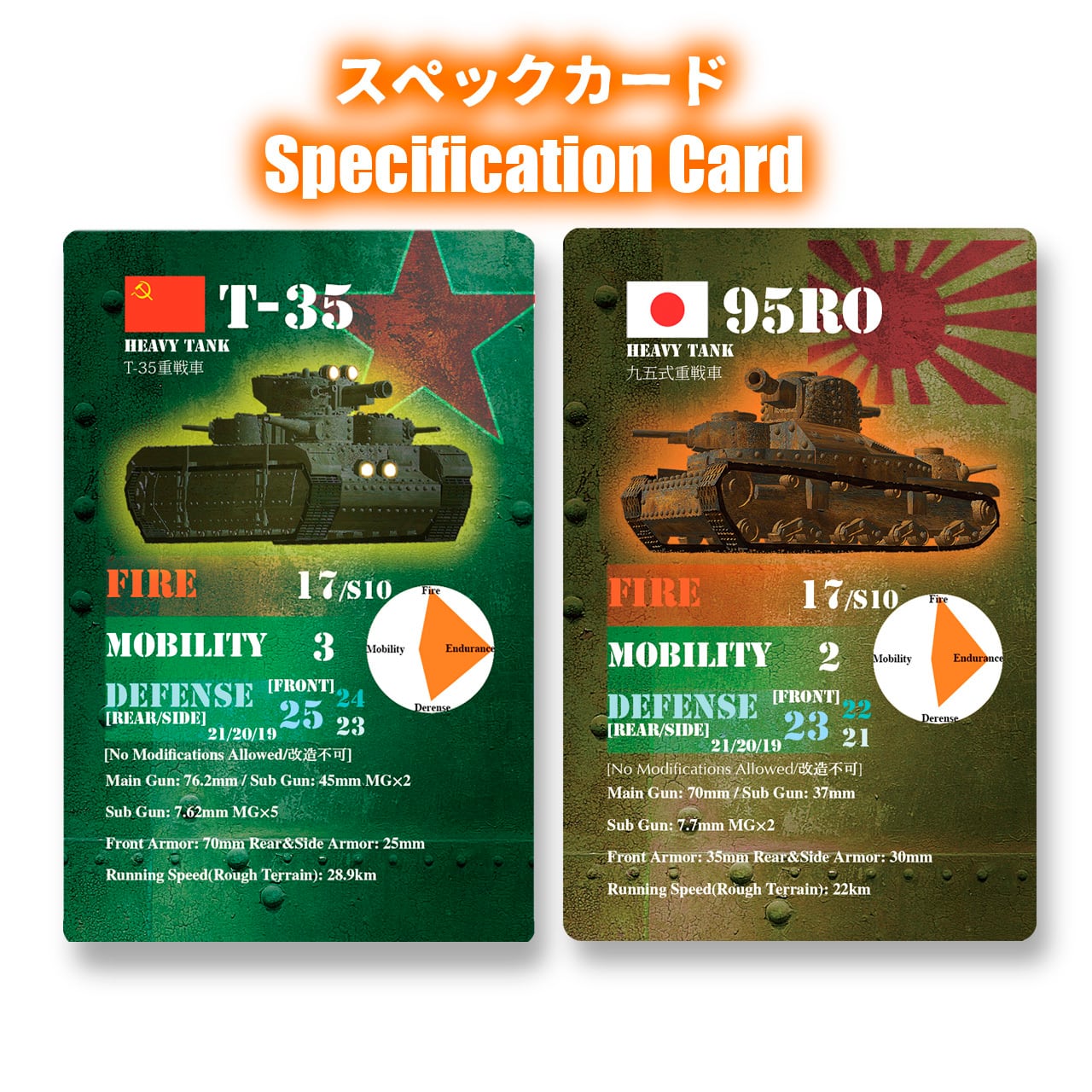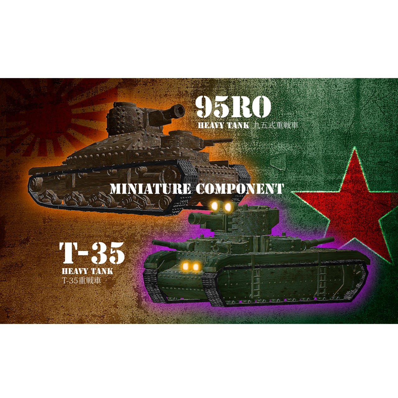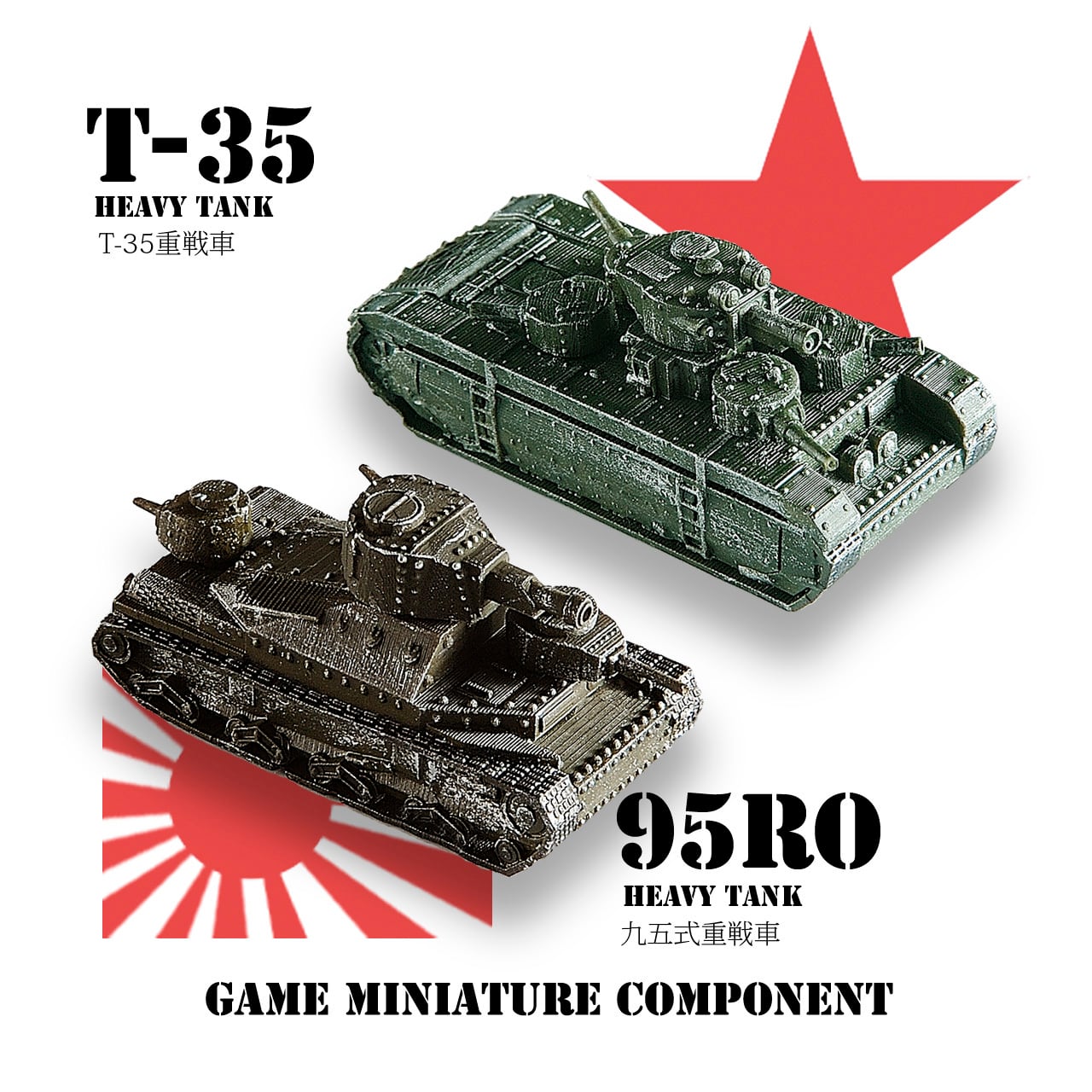 ミニチュア戦車ボードゲーム「ハルハ河1939」に使用可能な、1930年代の日本軍・ソビエト軍の重戦車が1両づつ入っています。ボードゲームで使用できる、戦車の性能表カードが同梱されています。