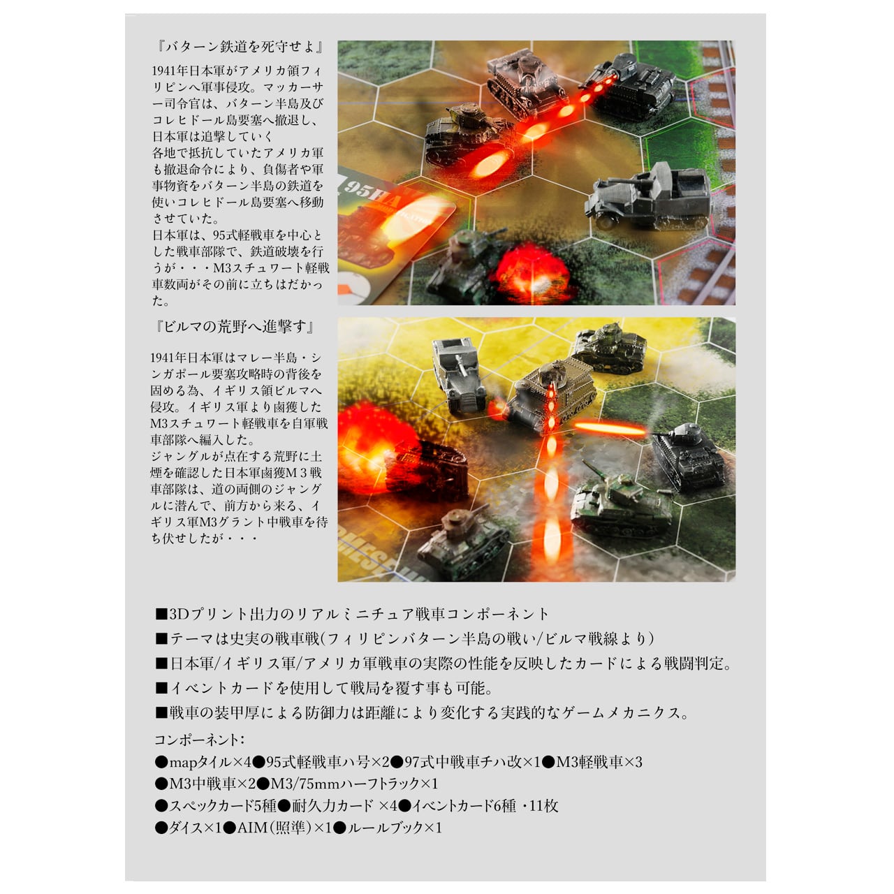 「バターン鉄道を死守せよ」では、西欧諸国の植民地政策からアジア諸国の解放を宣言した日本軍は、アメリカ領フィリピンへ侵攻する。制海権を持つ日本がアメリカ軍を追い込み、アメリカ軍はバターン半島で食い止めようとするが、敗退し半島先端のコレヒドール要塞へ撤退を行った。傷病兵と物資は鉄道で輸送する事になるが、その情報を掴んだ日本軍は、半島輸送の要である鉄道破壊の為、九五式軽戦車主体の部隊を差し向ける。アメリカ軍は稼働出来るM3軽戦車3両とM3-75mm搭載ハーフトラック1台で線路を死守する事になる。