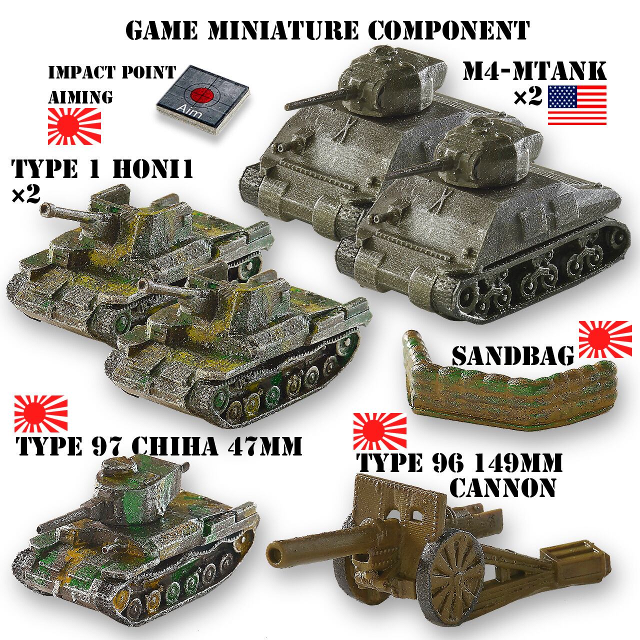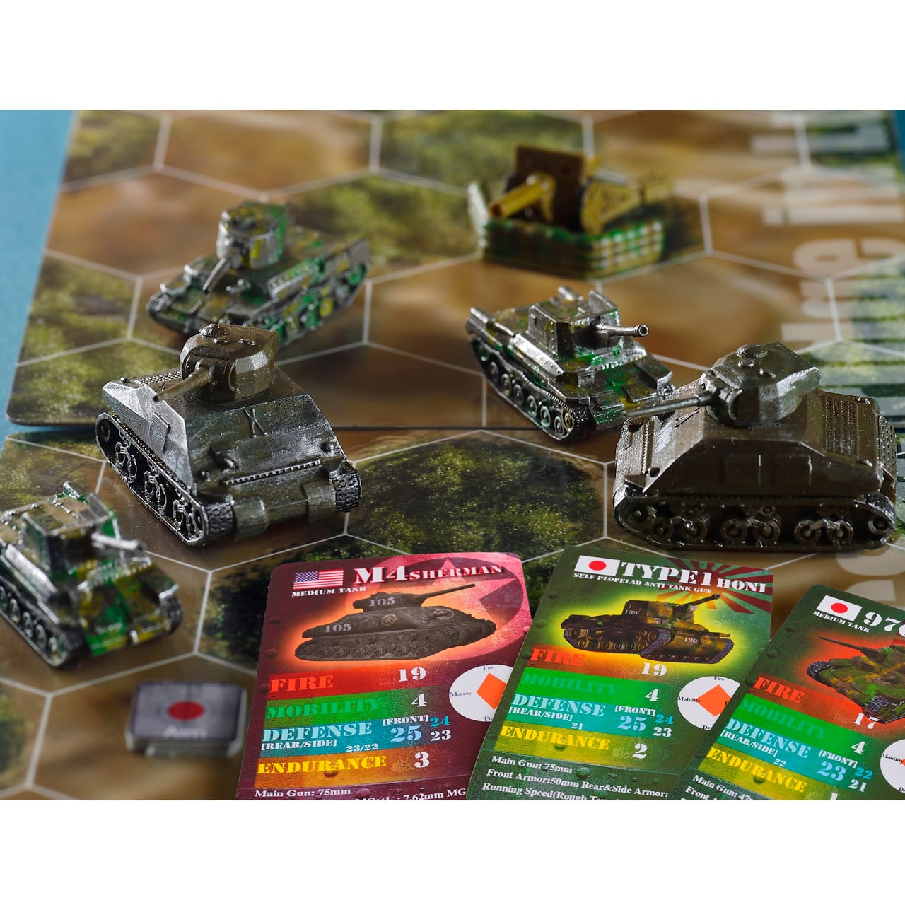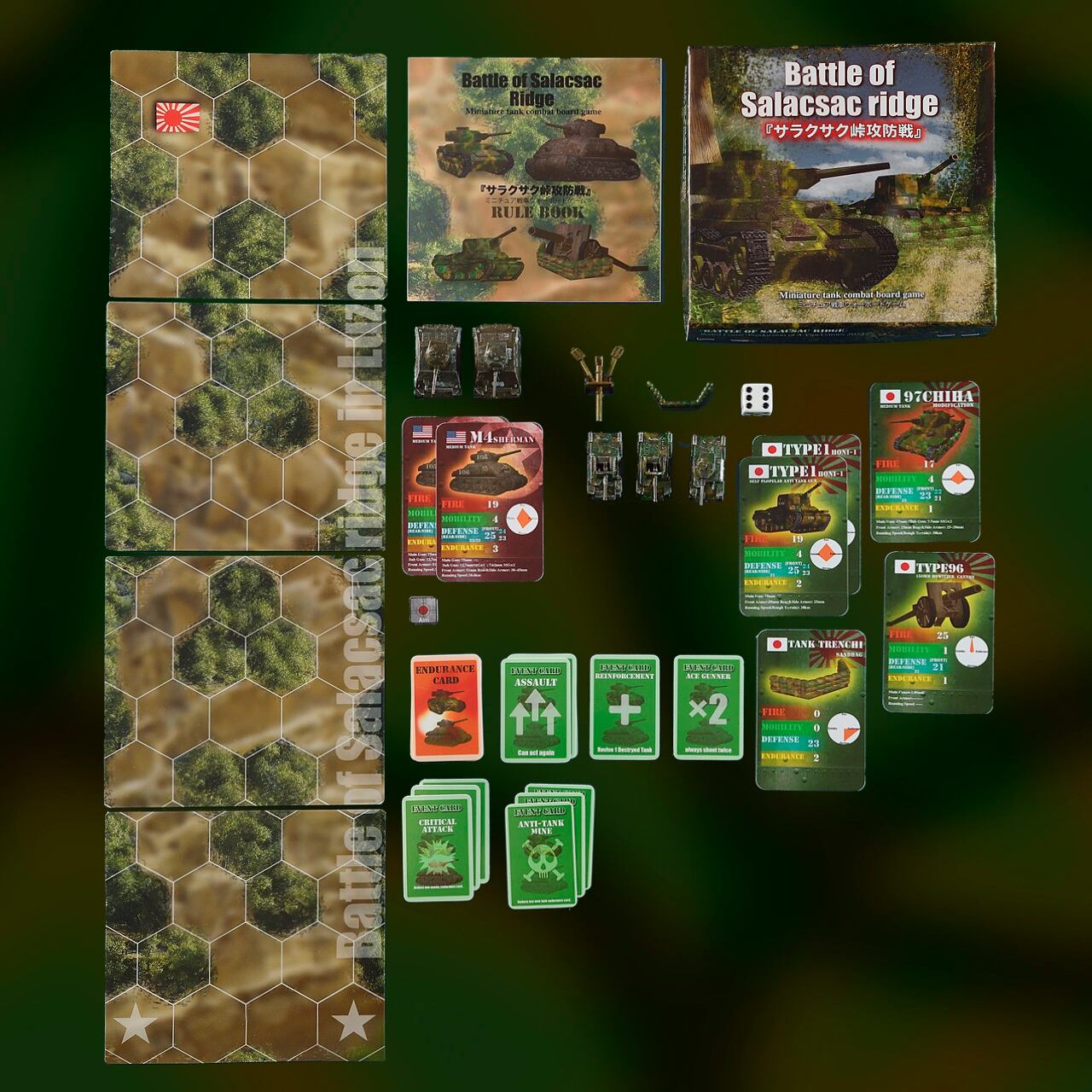 制海権も補給も見込めない日本軍の苦しいフィリピンルソン島防衛戦をテーマにしたボードゲームです。日本軍の戦車部隊は、輸送船を撃沈されてしまう為、増援も新型戦車もないまま、当時旧式化してきた、九七式中戦車チハ改などで戦いますが、性能差は埋められず苦戦します。当時の戦車の性能を活かしたスペックカードに反映された数値により、正面からアメリカ軍戦車と戦うと、まず日本軍は勝て無いと言う不公平なゲームバランスになっています。史実を再現していますので、日本軍は相当運に恵まれるか、地形や榴弾砲を上手く使わないと勝てません!